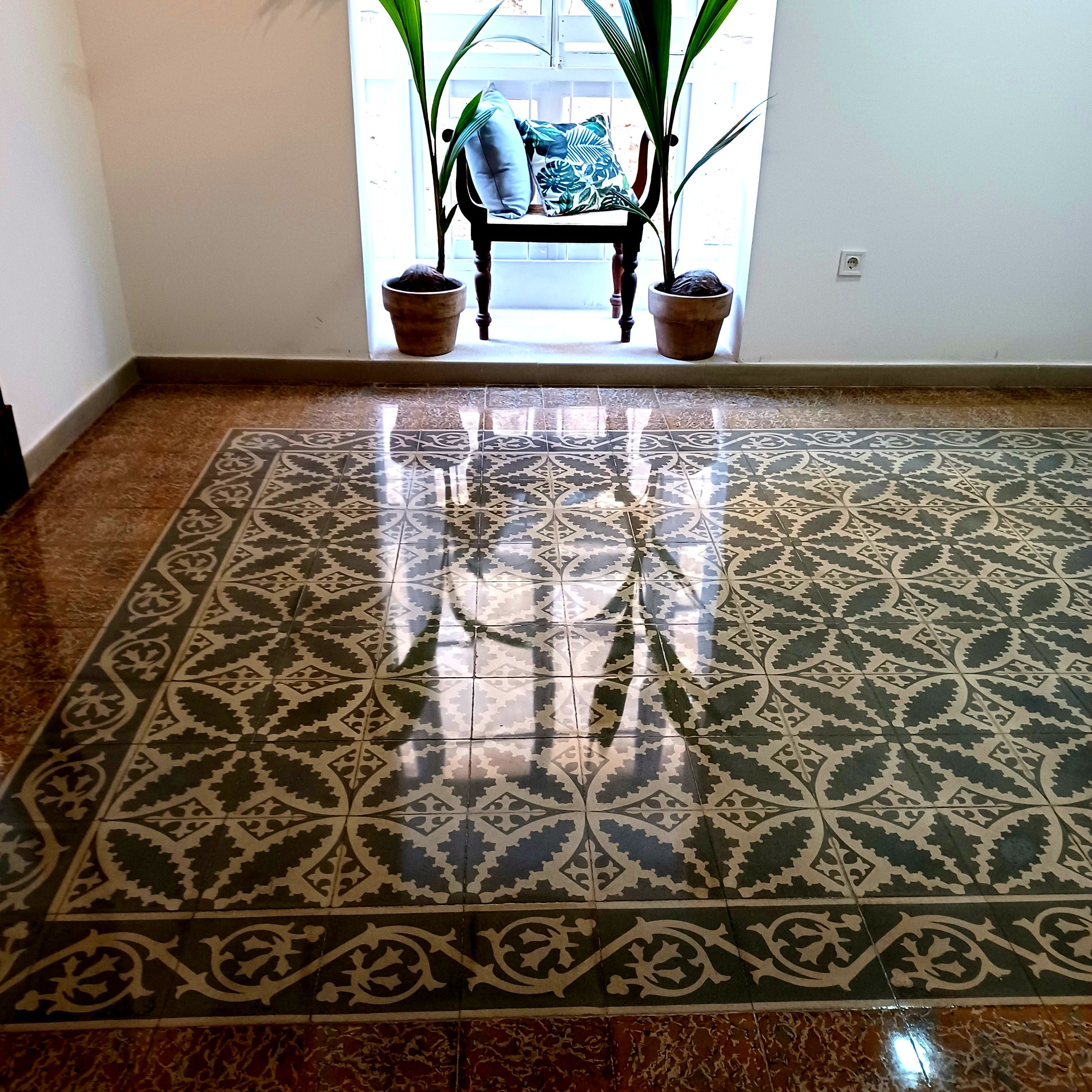 Suelo de baldosa hidraulica. Pulido y abrillantado. Palma de Mallorca.